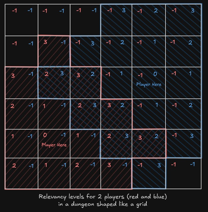 Here an example of the relevancy computed for 2 players. The max distance is set to 4, so a room is relevant up to a distance of 3 to the player (0 is the first iteration of the distance, the room where the player is).